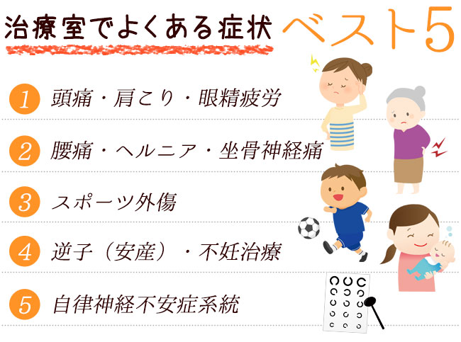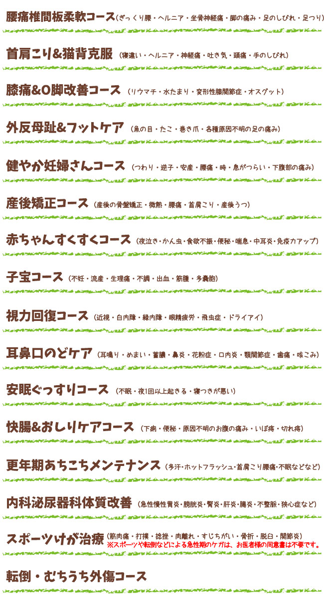 頭痛、不眠、寝違い、肩コリ、五十肩、腰痛、ヘルニア、 坐骨神経痛、腱鞘炎、膝痛、顔面神経マヒ、突発性難聴、 外反母趾、交通事故むち打ち(自賠責)、眼精疲労、 視力回復、逆子、不妊、生理痛、更年期障害、 スポーツ障害、夜泣き、アトピーetc