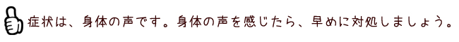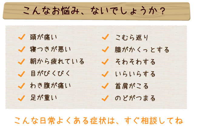 「痛い」「つり」「はり」「つらい」「だるい」「つまる感じ」「しびれる」「力がはいらない」「ひえる」「疲れている」「むずむずする」「重い」「汗がでる」「どきどきする」など色々あります。身体のゆがみや筋肉のこりが、深くかかわっています。