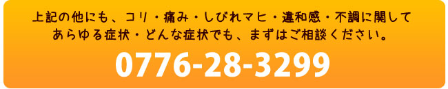 頚腕症候群、首肩の痛み・こり・腕のしびれ、腰痛、ギックリ腰、ヘルニア、坐骨神経痛、狭窄症、眼精疲労、目の奥の痛み・疲れ・目がしょぼつく・飛蚊症、頭痛、重い・ピリピリ、締めつけるような痛み、膝の痛み、歩く時に痛む、階段からおりる時に痛む、正座ができない、スポーツ外傷、捻挫・肉離れ・打撲、猫背・O脚、姿勢を骨格・筋肉の癖から矯正、交通事故によるムチウチ、レントゲン検査では異常なしと言われた、外反母趾、巻き爪、たこ・魚の目・原因不明の足の様々な痛み