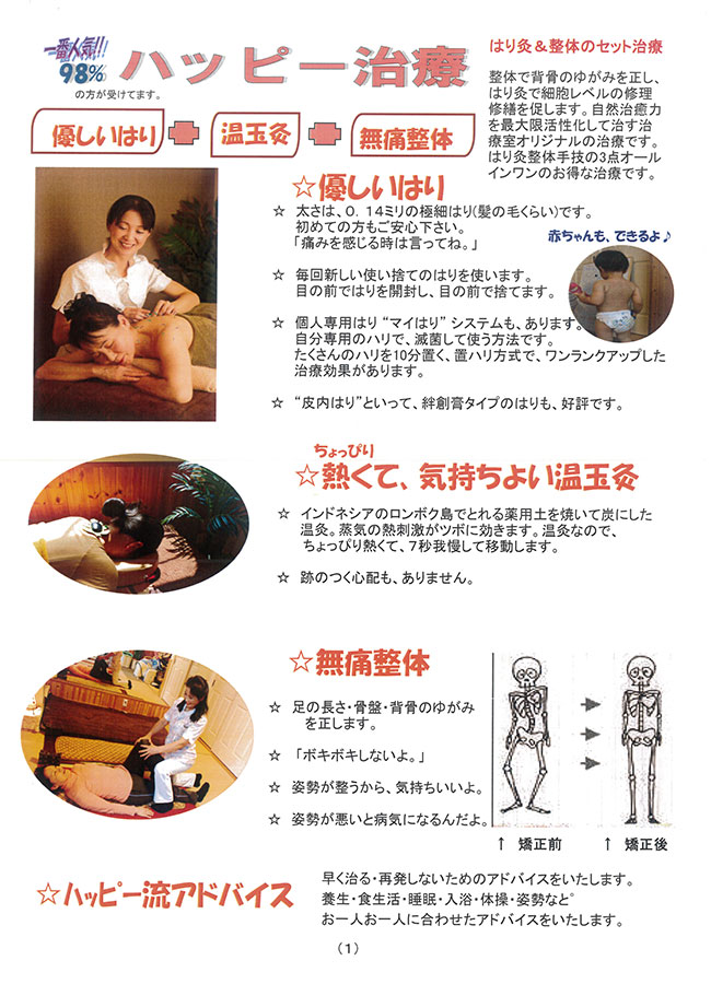 中でも、はり灸&整体のセット治療、ハッピー治療が一番人気のメニューです。