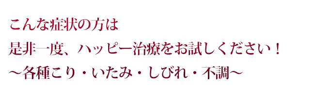 どんな症状も、10 年放っておくと、大病につながります。 私達の身体には、素晴しい自己治癒力があります。 身体は、副作用のない薬工場を体内にもっているのです。 私は、身体の症状は、はり灸・整体・マッサージで、“自然治癒力を最大限活性化し て治す”ことをおすすめします。 薬を現在飲まれている方、手術なさった方も、私 たちの治る力を存分に引き出してあげましょう。 身体が変わってきます。当院福井の鍼灸整体マッサージ専門院「ハッピー・治療室」 では、患者様の「治る力」を引き出す手助けを行っています。どんなささいなことで も構いません。「身体の声」が聞こえたら当治療室までお越しください。